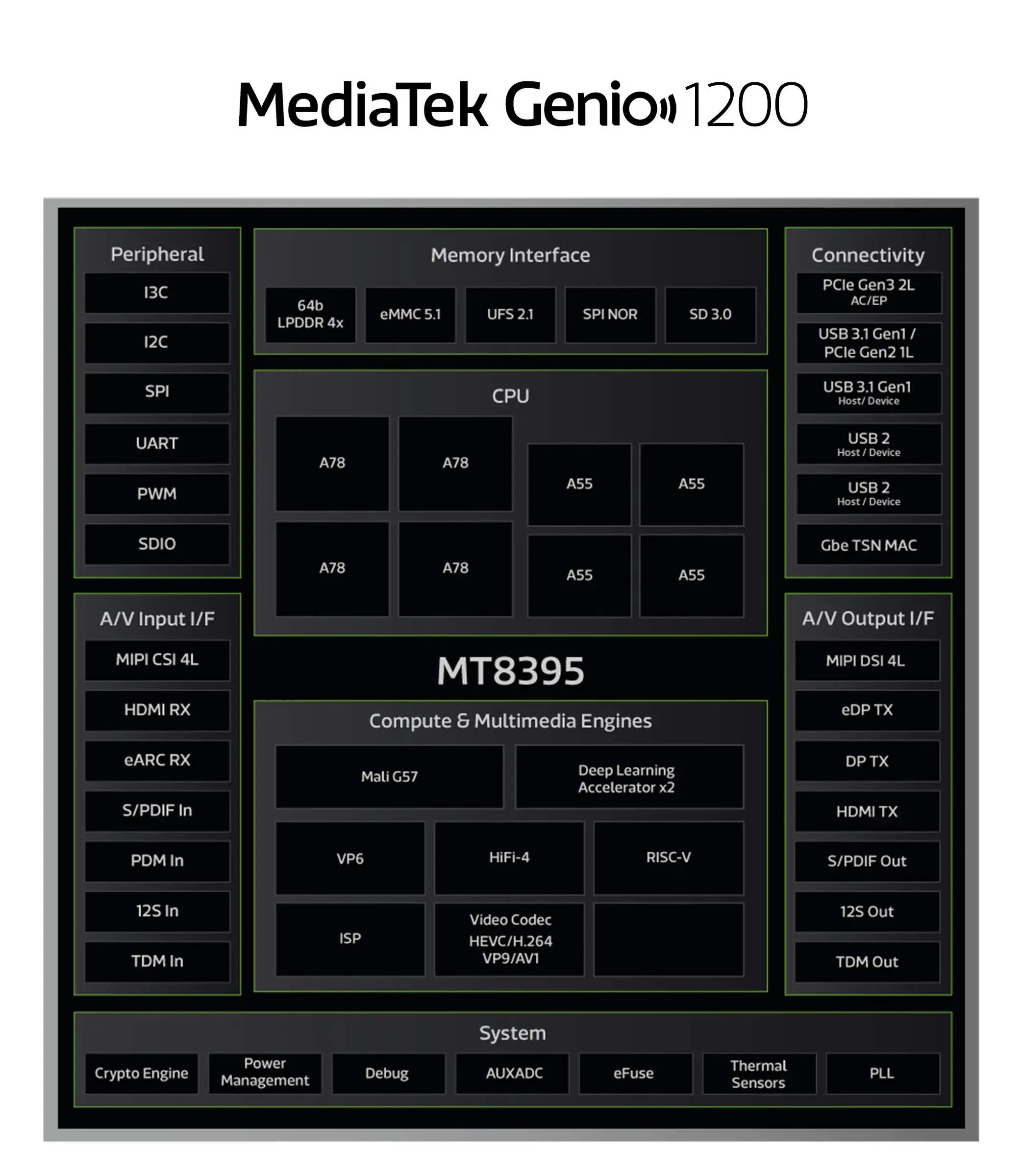 MediaTek Genio 1200 is a premium IoT SoC with integrated NPU. It provides superb performance, advanced multimedia and impressive power efficiency to meet wide ranging edge computing requirements. Its offers flexible, high-speed I/O and supports GbE and Wi-Fi 6 connectivity.